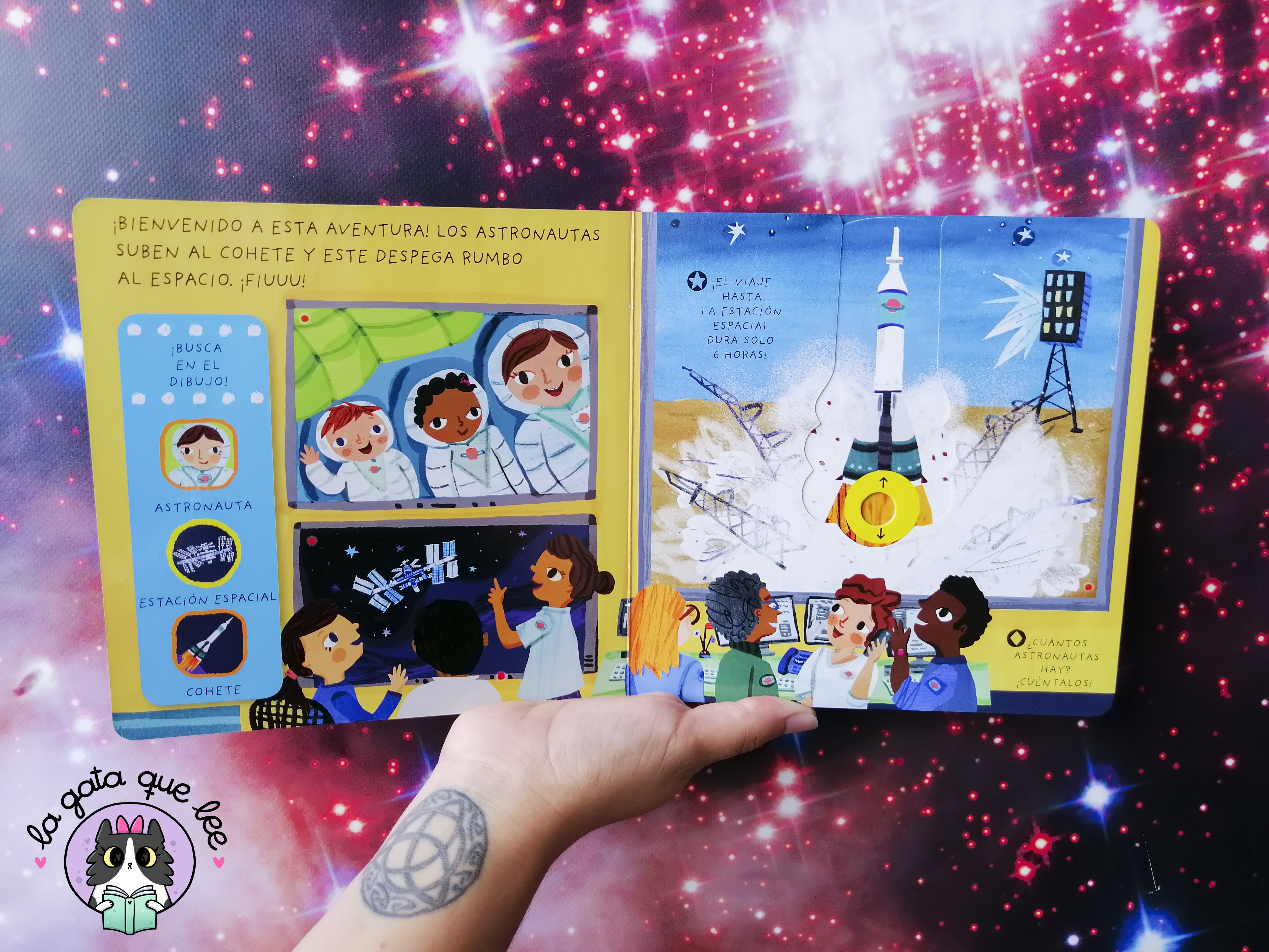 El libro muestra, a través de preciosas y divertidas ilustraciones, todo el proceso que viven los astronautas para subir a la Estación Espacial Internacional, además de cómo viven y trabajan allí, con ayuda de lengüetas y piezas móviles, que transforman el momento de lectura en un juego,.