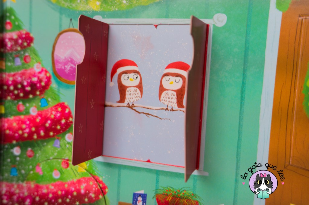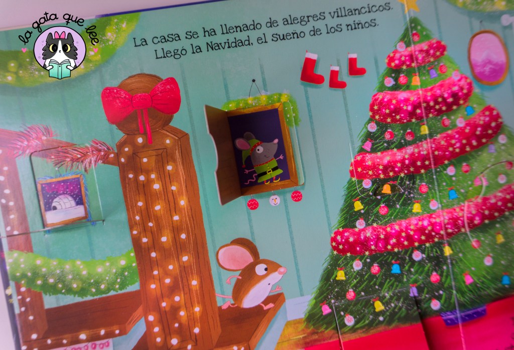 Mientras pasamos las páginas, encontramos diferentes escenarios navideñamente decorados: las escaleras y la entrada a casa, la mesa preparada para el festín familiar, el salón con su chimenea y su súper árbol, el jardín nevado con su muñeco de nieve ¡y hasta un iglú!, y la habitación donde ratoncito se irá nervioso a dormir, ¡a esperar que a la mañana siguiente ya estén los regalos bajo el gran árbol!