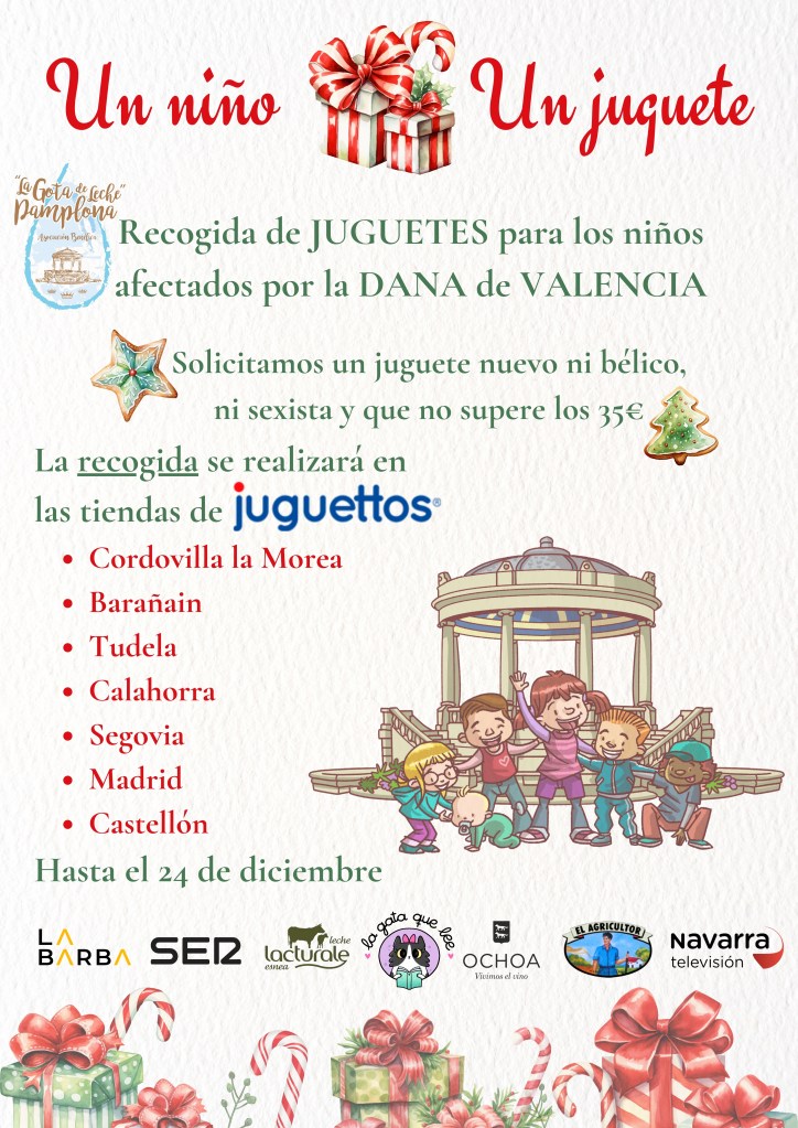 Los representantes de La gota de leche de Pamplona afirman: «Nos quedamos con la imagen de un niño que nos despidió de Catarroja y que nos motivó a hacer nuestro siguiente proyecto, que es la recogida de juguetes para los niños afectados por la DANA. Gracias a la colaboración de la juguetería Juguettos se va a realizar una recogida de juguetes en sus tiendas de Cordovilla la Morea, Barañain, Tudela, Calahorra, Segovia, Madrid y Castellón. Gracias a creer en nosotros y nuestro proyecto, y en colaboración con Pajes Mágicos, vamos a llenar de alegría e ilusión las calles». La recogida de juguetes ya ha comenzado y estará abierta hasta el 24 de diciembre.